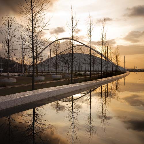 After a few shots, I noticed that the sun was setting in behind one of the pavilions. The sun, the clouds, the water mirror, the trees and the pavilion combined into this picture. I also find the line formed by the lake shore, combined with the lines of the pavilion, quite interesting.